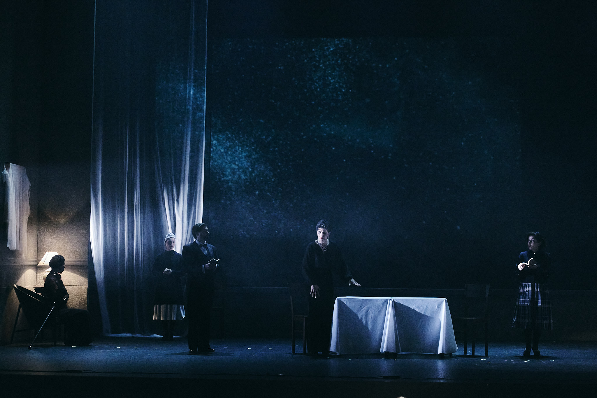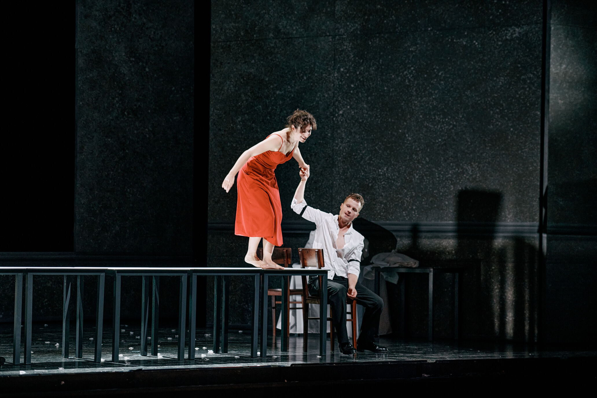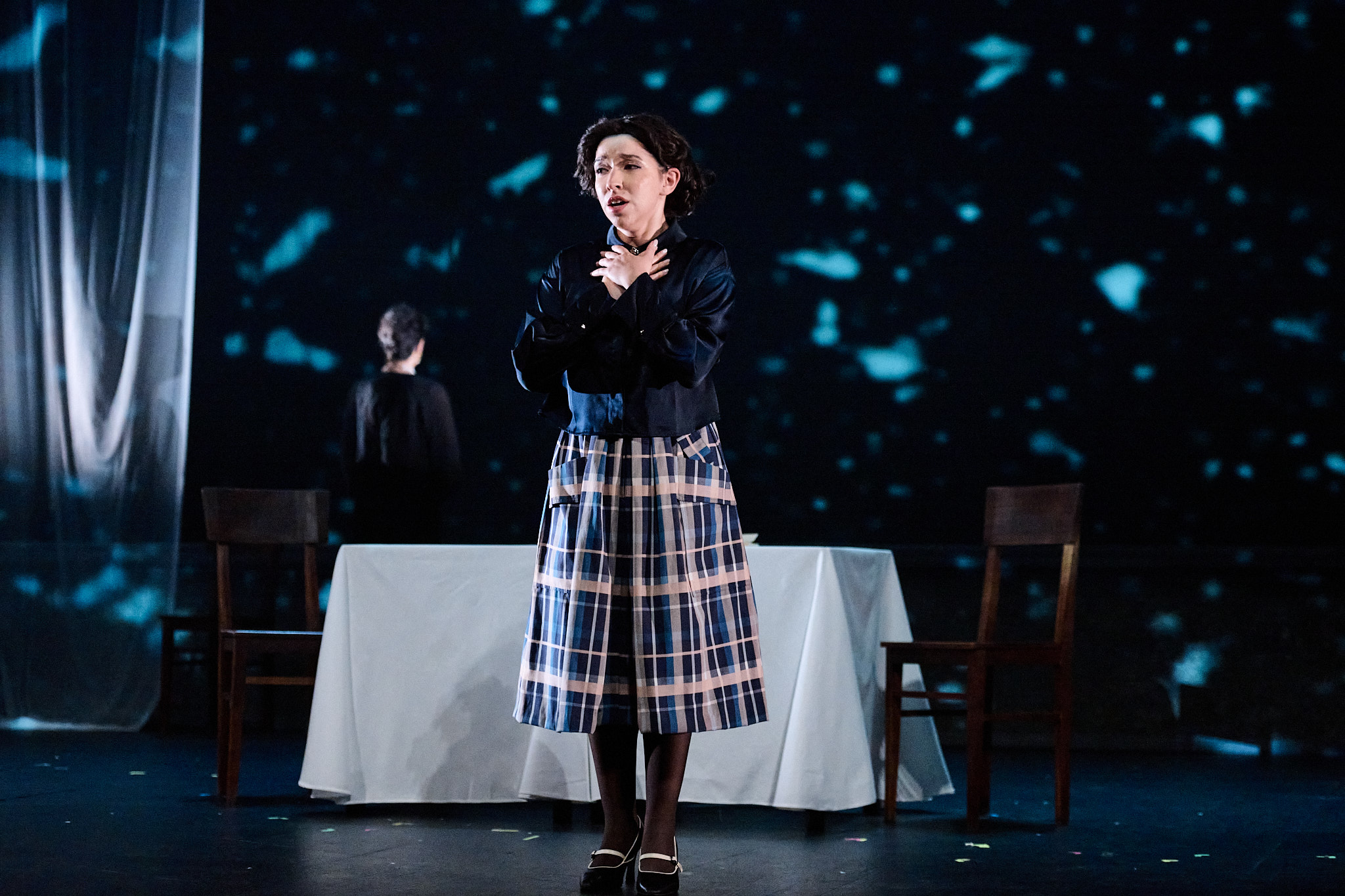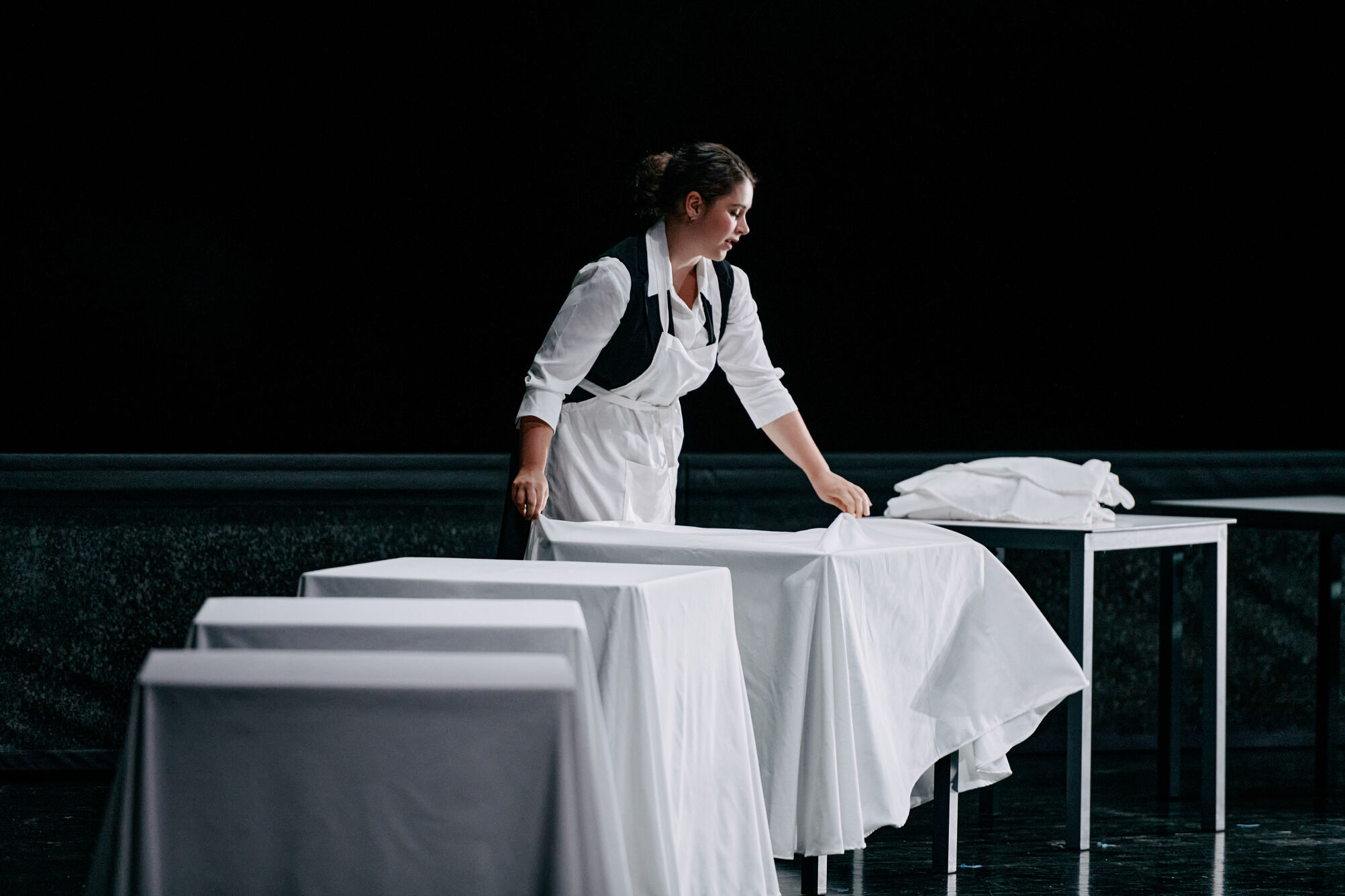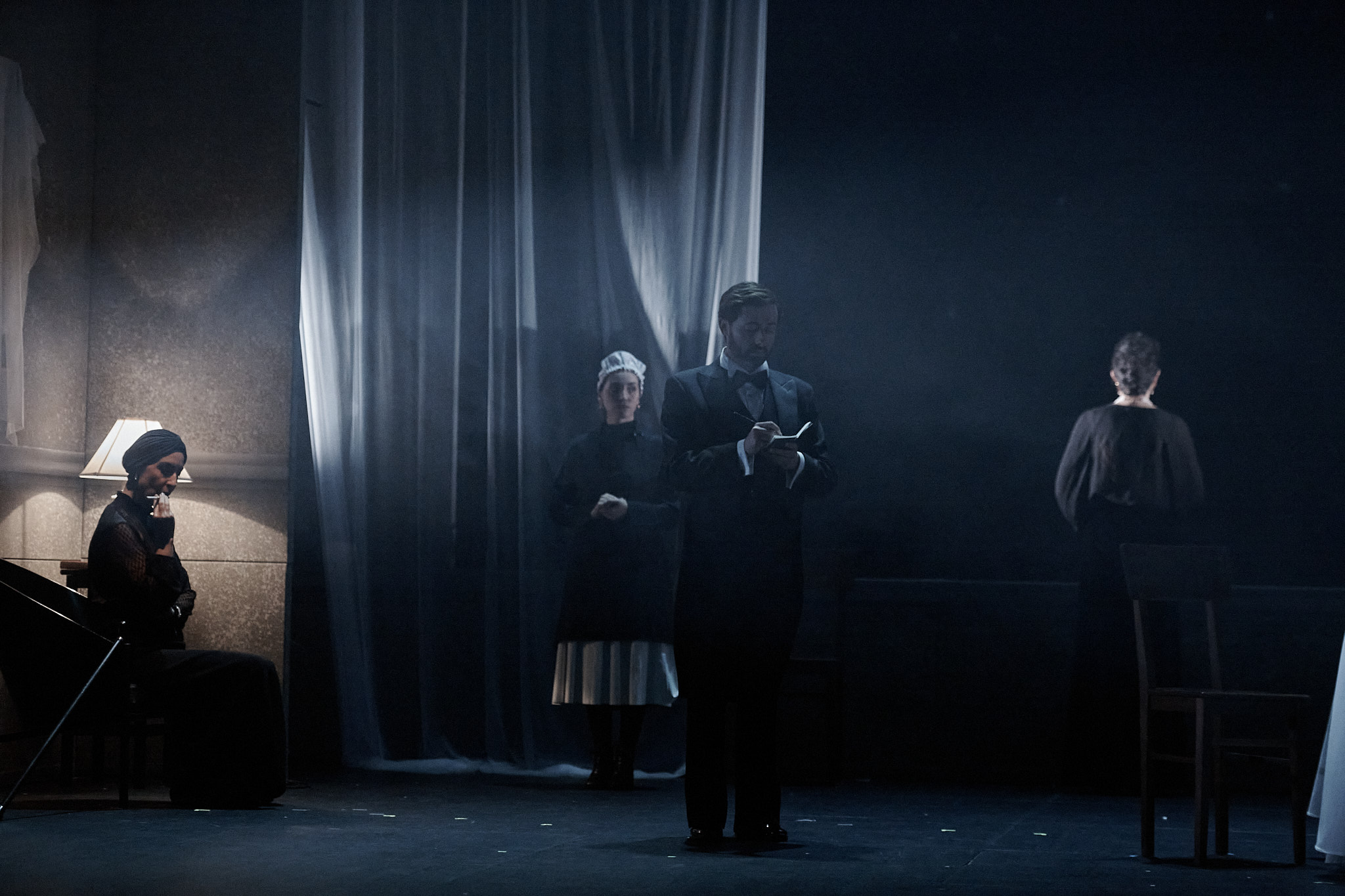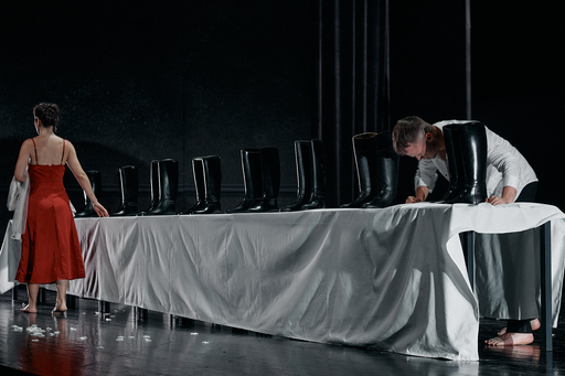 “A cenografia de Daniela Kerck e os figurinos de Hannah König enfatizam as tensões sociais, criando uma atmosfera visual austera e poderosa.” Première Loge